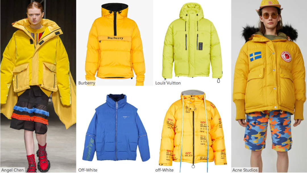 抗菌防护面料在羽绒服和户外服装上的应用已经越来越多,Off-white、Burberry等品牌推出全新概念产品。以潮流文化和全新的设计影响着千禧一代对于未来科技防护面料的趋势认同。