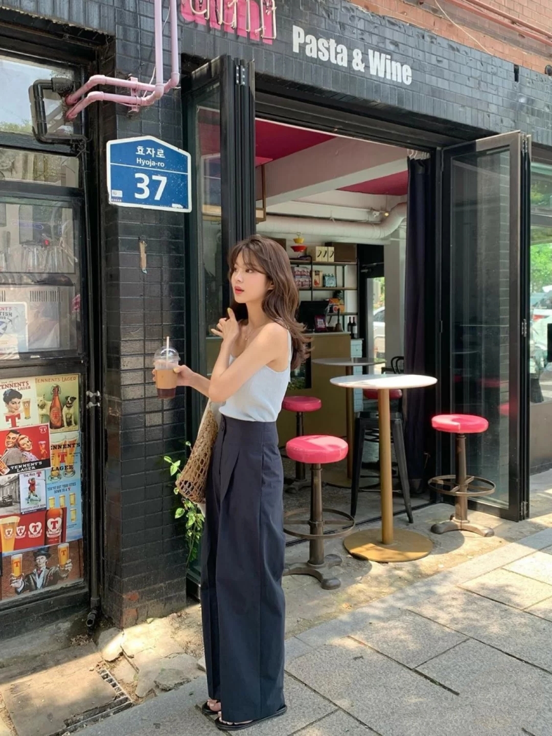 韩系穿搭基本都很简单,裤装或者半裙look遵循上短下长穿衣原则,款式上遵循上一简一繁原则,或者是上简单下也简单的穿搭,视觉上一目了然。米黄色短袖衬衣搭配黑色高腰阔腿裤,衣摆扎进裤腰中,利落又休闲,上下都很简单,休闲简洁又干净。