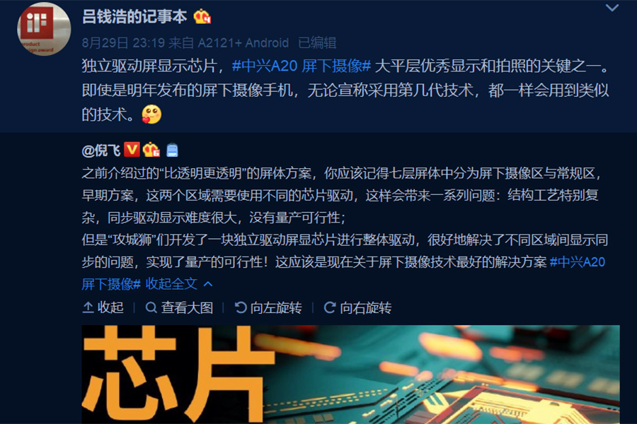 近期屏下摄像头手机上将要上市,造成了许多人的关心。尽管先发的知名品牌是zte中兴,但是在网上一下子也多了许多 知名品牌发出声响,表明自身也将要进到这一行业。而做为先发知名品牌的zte中兴,好像在宣传策划上并不强悍,如今有关屏下摄像头层面,反倒可谓是并不是强悍。但是这都不耽搁她们秀更新的技术性,zte中兴倪飞及其吕钱浩表明,新技术应用无论第几代都要用。