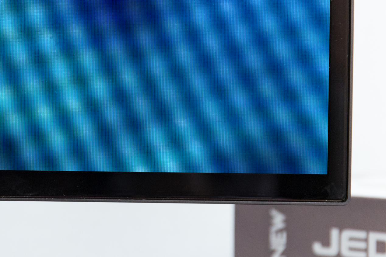 电视正面采用了四周无边框的设计,底部边框比其它三边稍微宽,但不注意看基本发现不了。如今的电视产品大多数都是三边窄、底部宽的设计,某些产品甚至会特意在底部加大音响系统的存在感,底部就会更宽。